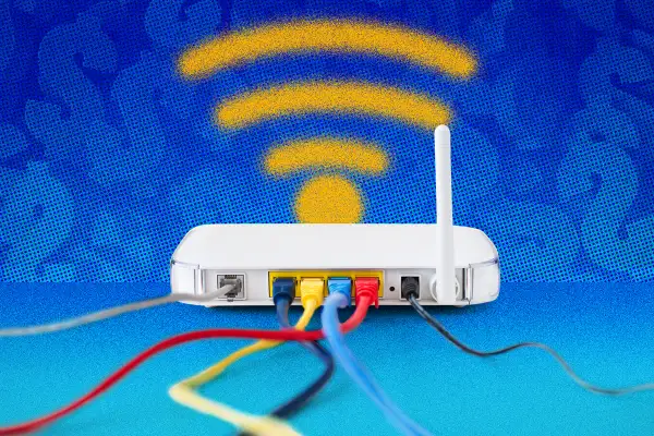 Photo illustration of a wifi router with faint money symbols in the background